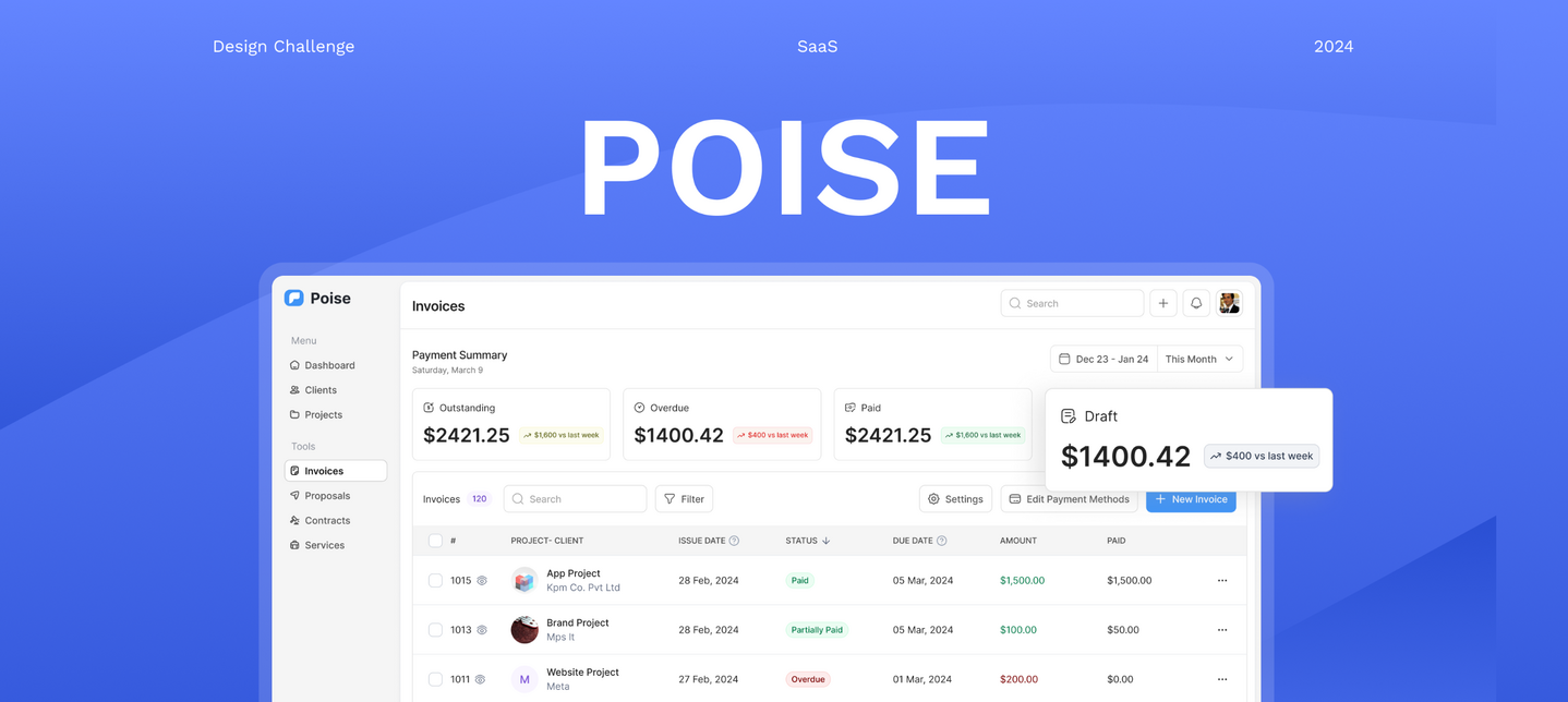 Poise is a SaaS Invoicing Software that helps freelancers keep track of payments and manage multiple clients.